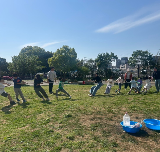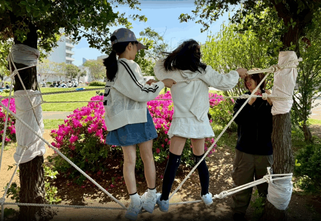 小学生は昔遊びやロープで作ったモンキーブリッジ、綱引きなど、目を輝かせながらそれぞれやりたい遊びに取り組んでいました。